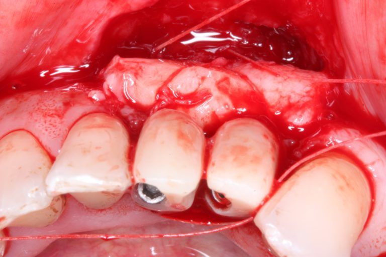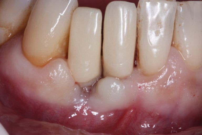 Vamos aqui mostrar um caso de grande reabsorção óssea devido problemas periodontais, que levou à exodontia dos elementos 41 e 42 com instalação imediata de dois implantes Slim de 2,5x12mm( Figura 1), com provisionalização imediata, devido pouco espaço mésio-distal que a paciente tinha, sendo esta uma das indicações deste implante. Após 4 meses a paciente retornou para reavaliarmos o resultado obtido e planejar as coroas cerâmicas. Notamos então grande perda do volume vestíbulo-lingual e recessão na região do 42( Figura 2 e 3), que já existia previamente ao procedimento cirúrgico. Programamos antes da confecção das coroas metalocerâmicas melhorar o volume vestibular e qualidade da mucosa peri-implantar com um enxerto de tecido conjuntivo proveniente da região da túber direita, onde avaliamos ter maior disponibilidade de tecido que do palato, além de ser mais bem aceito pela paciente com oárea doadora( Figuras 4,5 e 6).